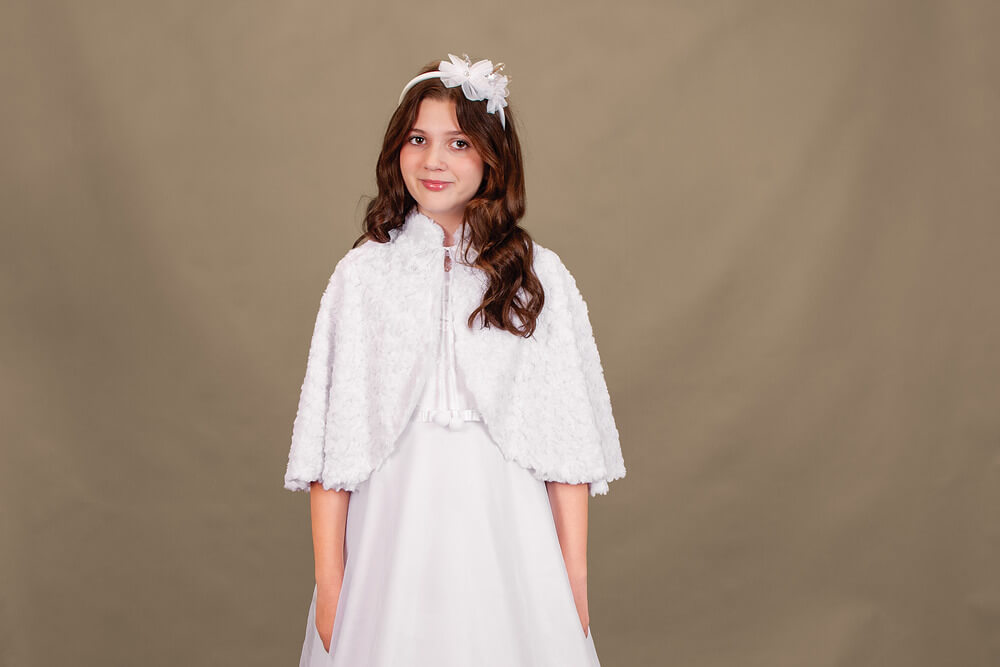 To bolerko na komunie to połączenie prostoty z elegancją, które doskonale dopełni każdą sukienkę do komunii . Wykonane z lekkiego materiału, zapewnia wygodę i swobodę ruchów, a jego minimalistyczny design wprowadza nowoczesny akcent do klasycznej stylizacji. Idealnie komponuje się z całością, podkreślając subtelność i szyk.