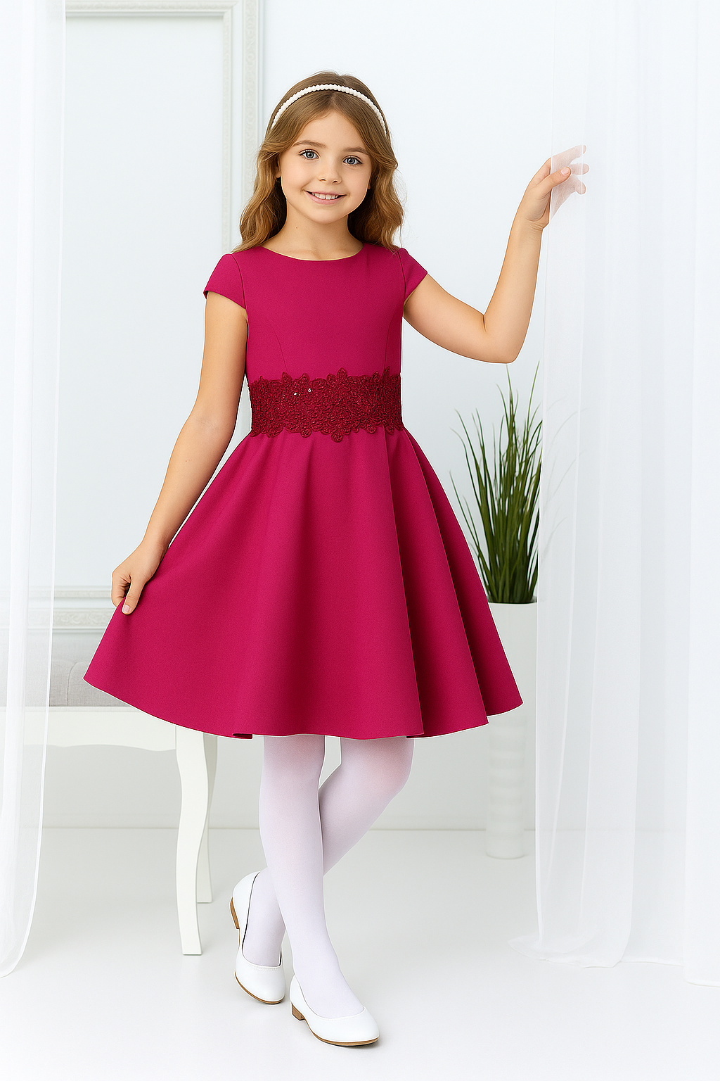 Sukienka wykonana jest z wysokogatunkowej tkaniny barbi w kolorze jagodowym, niezwykle modnym w tym sezonie.