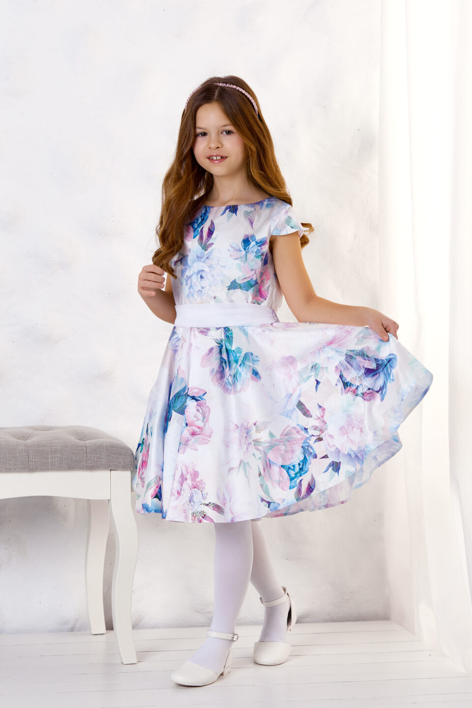 Subtelna, elegancka i bardzo dziewczęca sukienka w pastelowe kwiaty zachwyca lekkością i pięknie prezentuje się na każdej uroczystości. Delikatny, akwarelowy nadruk w odcieniach błękitu, fioletu i różu nadaje całości wyjątkowego uroku, a rozkloszowany dół typu klosz efektownie układa się w ruchu i świetnie wygląda podczas tańca. Biały pas w talii podkreśla sylwetkę i dodaje sukience odświętnego charakteru. Model idealny na wesele, komunię, urodziny, święta, akademie szkolne i rodzinne przyjęcia. Dzięki klasycznemu krojowi sukienka świetnie komponuje się z balerinkami, opaską lub delikatnym bolerkiem.